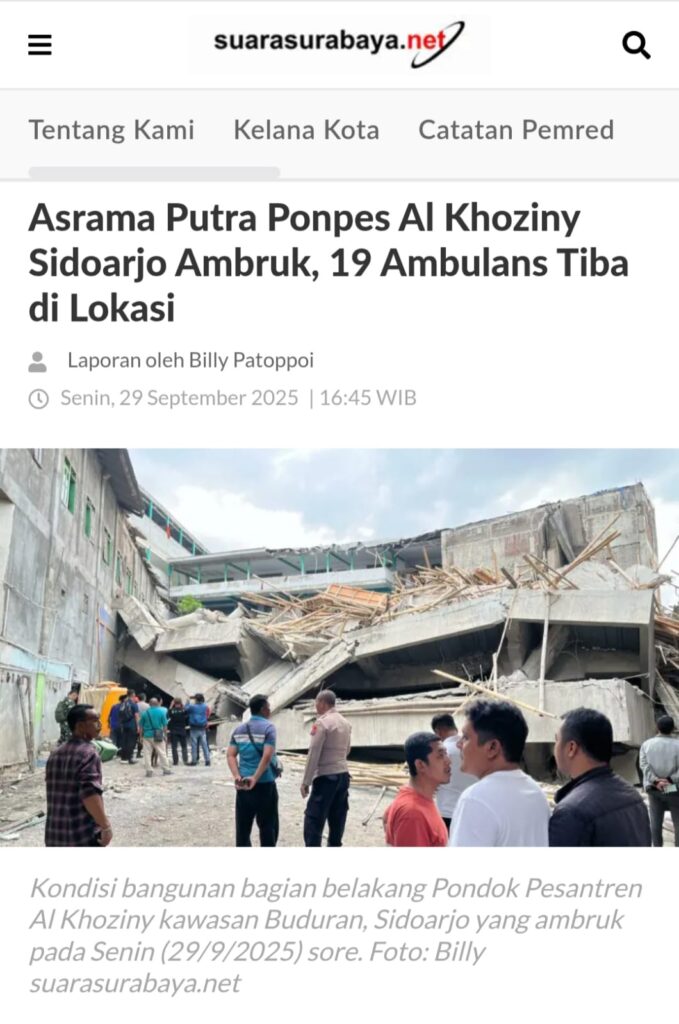 Miris melihat sikap pemerintah dalam menolong santri korban robohnya Pondok Pesantren (Ponpes) Al-Ghoziny Sidoarjo, Jawa Timur. Wajar jika keluarga korban ingin memaksa masuk ke lokasi longsoran. Pondok Pesantren tiga lantai ini roboh pada tanggal 29 September 2025. Sudah ada 14 korban meninggal dunia dan seratus orang santri luka-luka. Lambat sekali penanganan pertolongan bagi korban yang tertimbun di bawah reruntuhan bangunan Ponpes. Tim SAR menyatakan pada tanggal 1 Oktober 2025 menyatakan bahwa sudah tidak ada kehidupan di bawah reruntuhan bangunan Ponpes. Setelah 5 hari roboh baru ada satu alat berat diturunkan untuk menolong para korban yang masih di bawah reruntuhan. Sungguh sebuah kelambatan pemerintah dalam menolong korban manusia, para santri yang jumlahnya sangat banyak.