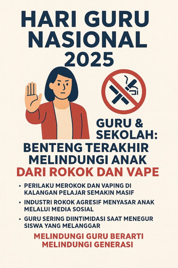 Jakarta, 25 November 2025 — Peringatan Hari Guru Nasional 2025 menjadi momentum refleksi mendalam tentang betapa beratnya tugas guru hari ini. Tidak hanya mendidik, tetapi juga harus melindungi anak dari ancaman baru yang kian agresif: rokok, rokok elektronik (vape), dan strategi pemasaran industri rokok yang semakin menyasar usia sekolah.