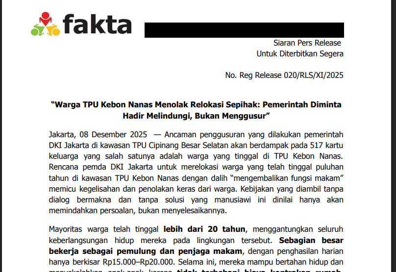 Jakarta, 08 Desember 2025 — Ancaman penggusuran yang dilakukan pemerintah DKI Jakarta di kawasan TPU Cipinang Besar Selatan akan berdampak pada 517 kartu keluarga yang salah satunya adalah warga yang tinggal di TPU Kebon Nanas. Rencana pemda DKI Jakarta untuk merelokasi warga yang telah tinggal puluhan tahun di kawasan TPU Kebon Nanas dengan dalih “mengembalikan fungsi makam” memicu kegelisahan dan penolakan keras dari warga. Kebijakan yang diambil tanpa dialog bermakna dan tanpa solusi yang manusiawi ini dinilai hanya akan memindahkan persoalan, bukan menyelesaikannya.